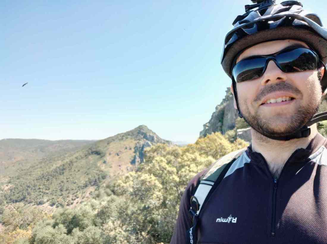 It was then time to go down. On foot. on a narrow path. With a loaded bike. It was a slog. Sometime in the middle, I stopped for a rest, where I took a selfie with a Spanish imperial eagle: